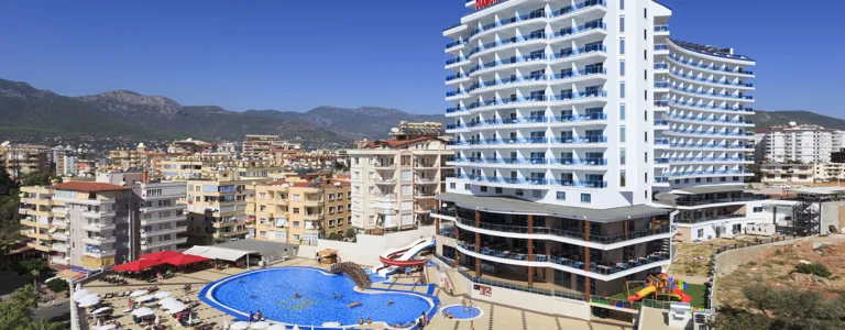 nově zavedený hotel, vybavení hotelu na slušné úrovni, čistý, příjemný personál. Problém - kapacita výtahů - celkem 3 nestačí pro hotelové hosty. Kapacita jídelny v průběhu večeří neodpovídá počtu hostů-málo místa k sezení. Nabídka jídel pestrá a velmi chutná, bylo doplňováno po celou dobu večeří. Snídaně , obědy v hotelu bez problémů s místem.Bary v hotelu velmi dobrá nabídka alko, nealko nápojů a míchaných koktailů z domácí nabídky. Super bar 24 hod. Pláž čístá , písečná, vstup do vody pozvolný s drobnými kamínky-boty nejsou nutné.Lehátka a slunečníky na pláži dostatek po celý den, vybavení ručníky na pláž k dispozici. Bar na pláži, nabídka nápojů a jídla v čase oběda dostačující, chlazené i teplé nápoje. Dostupnost pláže cca 150m bez problémů.Hotel není přímo na pláži - jedná se spíše o typ městského hotelu-není hotelový park a zelen u hotelového bazénu. Bazén čistý udržovaný s lehátky - velká obsazenost. Bar u bazénu - alko, nealko, zmrzlina, obědy,ovoce. Výborná dostupnost do centra, velmi dobré možnosti nákupů. Zábava a kulturní vyžítí v rámci centra Alanyie velmi dobré.Nádherný výhled na moře, město z baru na střeše (21-01hod.) Celkově jsme byli spokojení.