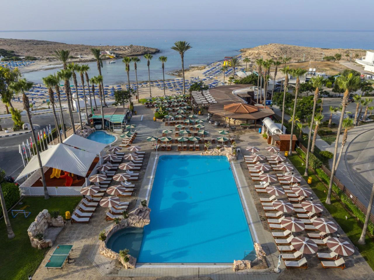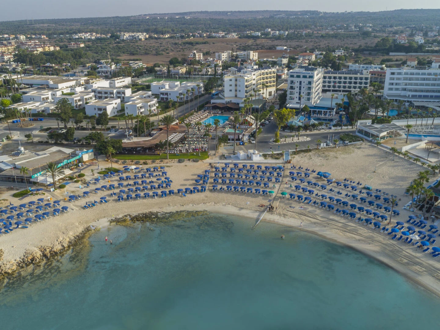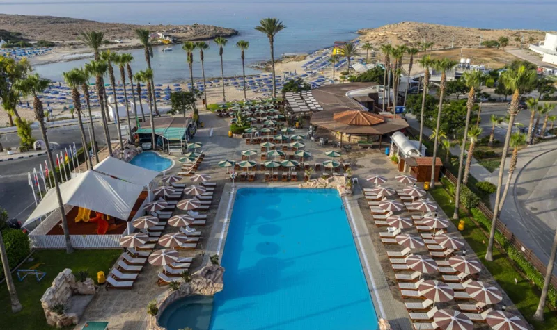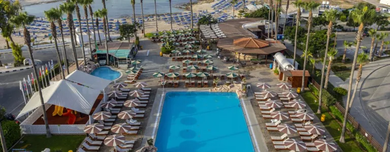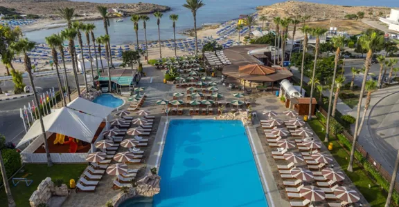 Tento hotel se nachází přímo u krásné písečné zátoky. Centrum Ayia Napa, s jeho nákupních střediscích, barů, kaváren, restaurací a nočních klubů, je pouze asi 2 km od hotelu a je pohodlně dostanete městskou hromadnou dopravou. Zastávka veřejné dopravy se nachází pouhých 50 m od hotelu. Lunapark, starý klášter a městské muzeum jsou jen hrubě 2 km, vodní park je asi 3,5 km od hotelu. Paralimna je asi 10 km daleko a transfer na letiště trvá asi 40 minut.