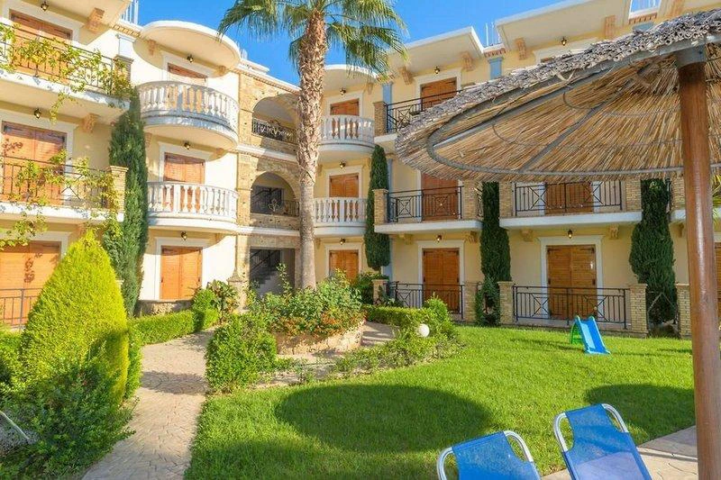 Apartmánový hotel je z roku 1989. Objekt hostům nabízí celkem 48 pokojů. Ty se nacházejí buď v 3patrové hlavní budově nebo v jedné z 3 vedlejších budov. Vedlejší budovy mají maximálně 3 poschodí. Po příjezdu jsou hosté uvítáni ve vstupní hale s recepcí. Do všech poschodí lze vyjít po schodech nebo pohodlně vyjet výtahem. V hotelu je šatna, úschovna zavazadel, hotelový sejf a směnárna. Ve společných prostorách se mohou hosté přes WiFi připojit k internetu. Na rezervační přepážce vám rádi pomůžeme s výběrem a rezervací výletů Nachází se zde několik stravovacích zařízení, například restaurace, jídelna, snídaňový salónek, kavárna, bar a hospoda. V areálu je hezká zahrada a hřiště. Nachází se zde také novinový stánek, TV místnost a dětská herna. Ti, kteří přijeli vlastním autem, mají k dispozici parkovací místa. Jízdní kola je možné nechat v úschovně kol. Apartmánový hotel nabízí lékařskou službu, transfer-servis, pokojovou službu, prádelnu a kadeřnictví. Aktivní hosté, kteří se chtějí projet po okolí na kole, si mohou půjčit kolo (za poplatek).
