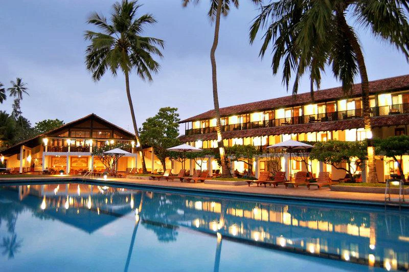 Hotel je umístěn přímo na pláži, od které jej dělí pouze plot z rákosí – ten má asi zabraňovat návštěvám všude přítomných domorodců – obchodníků, kteří jsou ovšem neškodní a pro Sri Lanku typicky milí. Oceán byl v době naší návštěvy (letní monzun) rozbouřený, o v hodnosti koupání informovala barva vlajky před hotelem. Jak u bazénu, tak i v zahradě hotelu jsou klientům k dispozici lehátka, venkovní bar (koktejly, džusy, pivo), 2 restaurace. Personál je milý a laskavý, samozřejmě očekávající bakšiš za každou drobnost, což je ale v těchto zemích normální. Pokoje jsou základně vybavené (klimatizace, sušák, větrák, rádio), prostorné, úklid je prováděn dvakrát denně, na noc rozdávány elektrické odpuzovače hmyzu i s tabletou – není třeba vozit vlastní, na požádání fén, moskytiéra. Strava velmi pestrá, obě restaurace nabízejí jak místní, tak evropská jídla, výběr vín a koktejlů. K večeři navíc často pořádány grilovací večery – humři, langusty, krevety… Co se týče večerní zábavy, samotný hotel v době naší návštěvy žádné programy nenabízel. Venkovní bar byl otevřen do 24 hod, ovšem bez hudby, bez života. Ale i tak se dá strávit zábavná dovolená, nebojte se vyrazit za brány hotelu a navázat kontakt s místními, třeba se jako my dočkáte pravého srílanského pohoštění za zvuku bubnů na pláži. Nebojte se s místními vyrazit i na výlety po okolí či do vzdálenějšího vnitrozemí, dají vám mnohem lepší ceny než cestovka a ukážou věci, které byste s agenturou nepoznali.